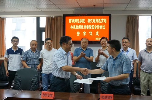 8月3日,学校党委副书记孙建平赴都江堰市教育局与李桦局长签订《阿坝师范学院 都江堰市教育局 共建教师教育实验区合作协议书》。出席签字仪式的有学校对外合作处长吴天德、江瑜清老师和教务处李久东老师。都江堰教育局副局长吴介才和局办公室、人事科、对外合作科、教师进修校等相关领导参加。